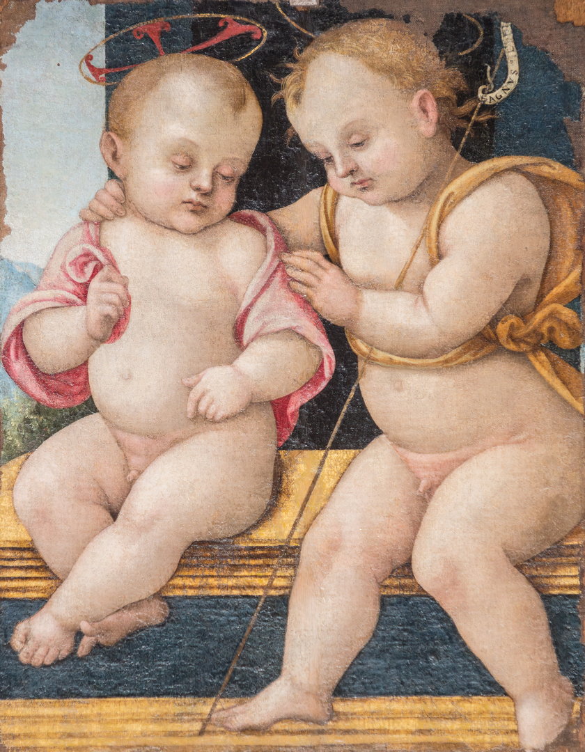 Questa preziosa, piccola tavola raffigura il piccolo san Giovanni Battista che cinge con il braccio le spalle di Gesù bambino benedicente. I due fanciulli sono appoggiati a un davanzale dietro il quale si apre uno spazio semiaperto che lascia intravvedere un arioso paesaggio. La tavola, come suggeriscono i bordi decurtati, doveva probabilmente avere dimensioni maggiori. Sappiamo che nel corso del XIX secolo subì un restauro condotto dal pittore Carlo Fantacchiotti. Le fonti sette-ottocentesche hanno tirato in ballo una possibile autografia raffaellesca; autografia non confermata dagli studi successivi che hanno parlato piuttosto di un lavoro nato nella bottega di Pietro Perugino. Va notato, del resto, che i due fanciulli ripropongono fedelmente un dettaglio della pala del Vannucci raffigurante La Famiglia della Vergine. Commissionata nel 1500 da Angelo di Tommaso Conti per la cappella di Sant’Anna in Santa Maria degli Angeli, la pala fu requisita dai francesci nel 1797 ed è oggi conservata al Musée des Beaux-Arts di Marsiglia.