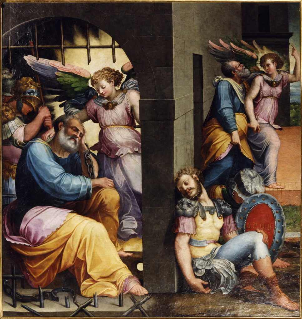 La scena si ispira al celebre prototipo della Liberazione di san Pietro della Stanza di Eliodoro in Vaticano affrescata da Raffaello, in particolare nella descrizione accurata dell’inferriata traforata e nel forte contrasto luministico creato dalla luce dell’angelo che squarcia le tenebre della prigione. Spiccano le preziosità di alcuni dettagli decorativi, come la corazza del soldato addormentato in primo piano, l’elmo dorato di quello alle spalle di san Pietro e il gioiello che arricchisce le vesti leggere dell’angelo. Il forte richiamo alla pittura raffaellesca testimonia la fortuna che il cantiere farnesiano della Rocca Paolina ebbe nella pittura perugina di metà Cinquecento; non a caso Orazio Alfani, autore delle Storie dei santi Pietro e Paolo, venne affiancato, in questa prima impresa per San Pietro (1547-1548), da Leonardo Cungi, un pittore della stretta cerchia vasariana.