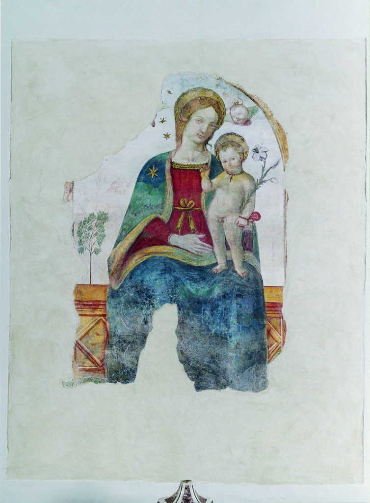 L’immagine affrescata della Madonna del Giglio si trovava in una cappella viaria in località Valiano nei pressi del monastero e godeva di una fortissima devozione per un miracoloso ruolo taumaturgico, tanto che papa Urbano VIII, tra il 1642 e il 1643, ne decise il trasferimento nella basilica perugina di San Pietro, in un sacello appositamente costruito. L’opera si può riferire a Giovanni di Pietro detto lo Spagna, un pittore di origine iberica fortemente influenzato da Perugino. Fu molto attivo a Spoleto e nell’Umbria meridionale; particolarmente abile come frescante, eseguì anche importanti pale d’altare come quella per il convento di Montesanto a Todi raffigurante l’Incoronazione della Vergine. In quella tavola, oggi conservata nella Pinacoteca Conunale di Todi, dimostra di conoscere, come del resto Raffaello altro suo importantissimo referente, il famoso prototipo di Domenico Ghirlandaio dipinto nel 1486 per la chiesa minoritica di San Girolamo a Narni. La Madonna del Giglio fu oggetto di tale venerazione che fu replicato diverse volte e non solo a Perugia. La più importante è certamente quella commissionata dall’abate Leone Pavoni, eseguita dal Sassoferrato intorno al 1636, prima del trasferimento dell’affresco staccato in chiesa; si conservano copie anche a Reggio Emilia (San Prospero) e Modena (San Pietro).