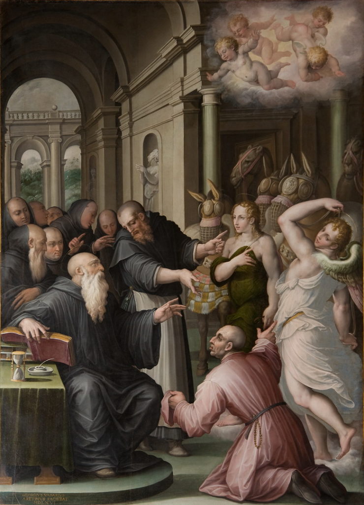 La plante, l’architecture à l’arrière-plan, le mouvement, la minutie dans la représentation des personnages sont à la base de la toile représentant le Miracle de la table de Saint Benoît: une œuvre qui montre clairement les racines de la culture figurative de Vasari chez Michelangelo. La manière sophistiquée de l’artiste se manifeste dans les contours élégants et les gestes des mains qui co-racontent le mouvement.