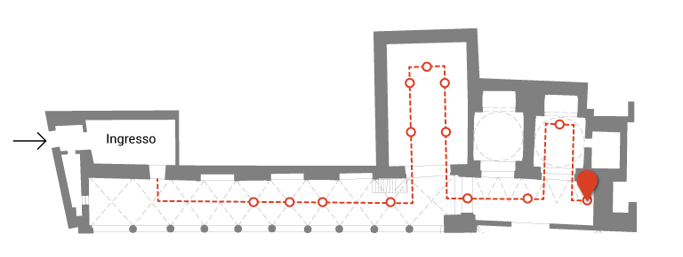 Le groupe est enfermé dans une sorte de chambre de marbre composée d’un siège en miroir et d’un dossard recouvert en partie d’un brocart, enrichie au sommet par une inscription tirée également des textes laudistes: « tuam ipsius animam [doloris] gladius pertramsivit ut revelentur ex mu [lt] is cordibus ”. Ci-dessous est la date de la peinture: « année Domini millième CCCC LXVIIII ».