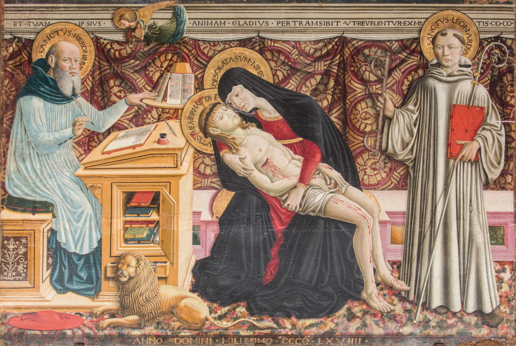 Le tableau montre la Madone soutenant le Christ mort. Sur ses côtés, Saint-Jérôme est inspiré par l’ange et soucieux d’écrire, et Saint-Léonard est reconnaissable à l’attribut traditionnel des menottes. Dans les auréoles de la Vierge et de Jésus figurent des litanies récitées lors des célébrations du vendredi saint (dans celle de la Vierge, il est écrit « desolata sum nimis »; dans celui de Jésus, « virtus mea infirmata est »).
