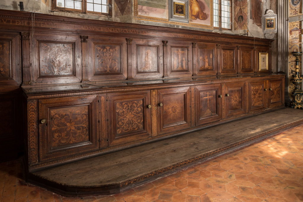 Pregiati prodotti dell’artigianato toscano del Rinascimento, gli armadi della sagrestia di San Pietro vennero realizzati, come ricordano i documenti, nel 1472 da Giusto di Francesco d’Incisa e Giovanni di Filippo da Fiesole. Gli armadi sono distribuiti sulle due pareti lunghe dell’ambiente rettangolare della sagrestia e sono costituiti da un doppio registro di specchiature in legno ornate al loro interno con decorazioni a intarsio, una tecnica che prevede l’accostamento di tasselli di legname di qualità e colore differenti. La maggior parte dei riquadri del registro inferiore presenta motivi vegetali, tranne nei tre pannelli centrali del lato sinistro, rispetto all’ingresso, nei quali è raffigurata la Croce affiancata da due monogrammi bernardiniani del nome di Cristo, composti dalle lettere “IHS” all’interno di soli raggiati. Nel registro superiore è possibile ammirare, sempre a sinistra, la scena della Crocifissione tra Maria e Giovanni affiancata da un San Pietro e un San Girolamo penitente. Nel lato opposto sono invece presenti, in due distinti pannelli, la Vergine annunciata e l’Arcangelo Gabriele distinti da un’elegante e sinuosa linea grafica. Tra i due personaggi è possibile scorgere la data 1472 riportata sulla cornice di una specchiatura raffigurante un vaso di fiori.
