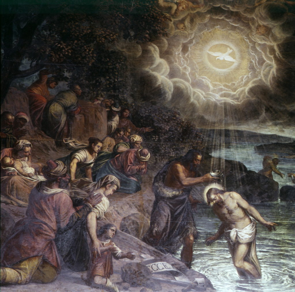 This canvas is part of a cycle of paintings centered on the life of Christ, commissioned by the Benedictines in 1593 to be executed by the painter of Greek origin, Antonio Vassilacchi, called l’Aliense. In the scene presented in the painting, The Baptism of Christ, the full contribution the skill of Jacopo Tintoretto contributed to the development of l’Aliense is apparent. The marked contrasts in the way the scene is lit, typical of luminists, which underscore the manifestation of the Divinity, and the dramatic and theatrical setting, where clouds and stormy skies are placed like the wings of a stage, are elements which call to mind the painting of Vassilacchi’s master. The background features the Old Testament scene of Naaman being cured of leprosy by Eliseo in the river Jordan. In each of these great canvasses, the Christological episode is associated with an event in the Old Testament, underscoring the coming of Christ as fulfillment of the word of the prophets.