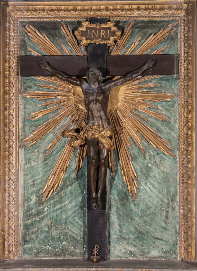Le Crucifix en bronze actuellement conservé sur l’autel en grès de la sacristie fait traditionnellement référence à la Bolognaise Alessandro Algardi, l’un des plus grands représentants de la sculpture baroque très active à Rome, où il a réalisé, entre autres, la tombe de Léon XI et le monument. en bronze par Innocent X dans la basilique de San Pietro. Le Crucifix de Pérouse, datable de la trentaine du XVIIe siècle, s’inspire du modèle du XVIe siècle, conçu par le sculpteur flamand Jean de Boulogne et baptisé Giambologna: il montre le Christ toujours vivant, les yeux tournés vers le ciel. Ces objets, également en raison de leur petite taille, étaient très recherchés par les clients privés. C’est pour cette raison que le Christ Algardien a été reproduit à plusieurs reprises. La version de San Pietro peut être utilement comparée à celle du Palazzo Pallavicini Rospigliosi de Rome. Alessandro Algardi a également laissé une œuvre en marbre à Pérouse, le buste d’Elisabetta Contucci, œuvre extraordinaire et virtuose encore visible dans le presbytère de l’église de San Domenico (1648).