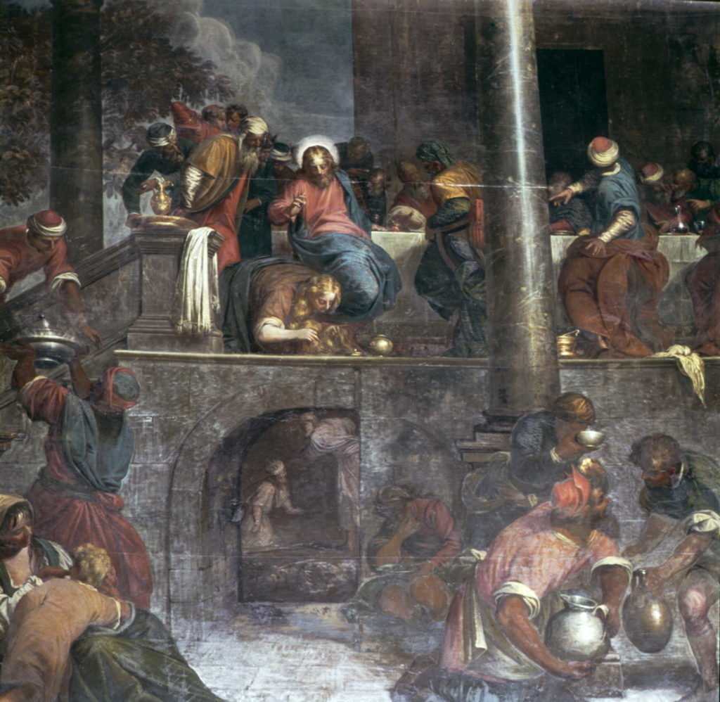 The large canvasses by Antonio Vassilacchi, a painter of Greek origin who trained under Veronese and Tintoretto in Venice during the second half of the 16th century, can be considered as a monumental, visual catechesis of high theological and didactic value. This canvas, depicting Jesus pardoning the adulteress in the Pharisee’s house, also features the prophet Nathan reproaching King David for his sin in the background. It becomes apparent, therefore, that the coming of Christ brings to fulfillment the divine events narrated in the Old Testament: pardon and the mercy of God are granted to whomever sincerely repents, and are the hope every sinner has of redemption. The main scene is set in a splendid building, where a number of figures move about in varying poses. The dark tone of the painting is pierced by the brilliance of the figure of Christ. This particular use of light, as well as the theatrical setting, are the result of l’Aliense assimilating the teaching of Veronese, through the interpretation of Tintoretto.