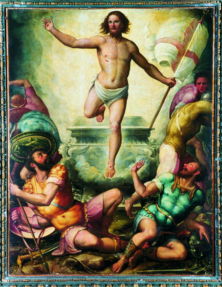 l pittore perugino Orazio Alfani, rientrato a Perugia nel 1545 dopo un lungo soggiorno in Sicilia, ottiene diverse commissioni in San Pietro a partire dal 1548, anno in cui prende accordi con Biordo degli Oddi per la decorazione della sua cappella: perdute le pitture della volta, rimane a testimoniare questa impresa la tavola con la Resurrezione, finita di pagare nel 1551. L’opera si colloca nella fase più evoluta dell’artista, quando forte e riconoscibile appare l’influsso dell’ultimo Raffaello, quello della celebre Trasfigurazione vaticana. Lione Pascoli sottolinea quanto importante sia stato per l’Alfani entrare in confidenza non solo con le opere romane dell’Urbinate ma anche con quelle di Michelangelo (“non passò giorno finché stette a Roma, che l’una, o l’altre non andasse a vedere, disegnare, e copiare”). Lo si vede nei personaggi che affollano il primo piano della Resurrezione ispirati a modelli michelangioleschi sia romani (Cappella Sistina) che fiorentini (Tombe medicee in San Lorenzo).